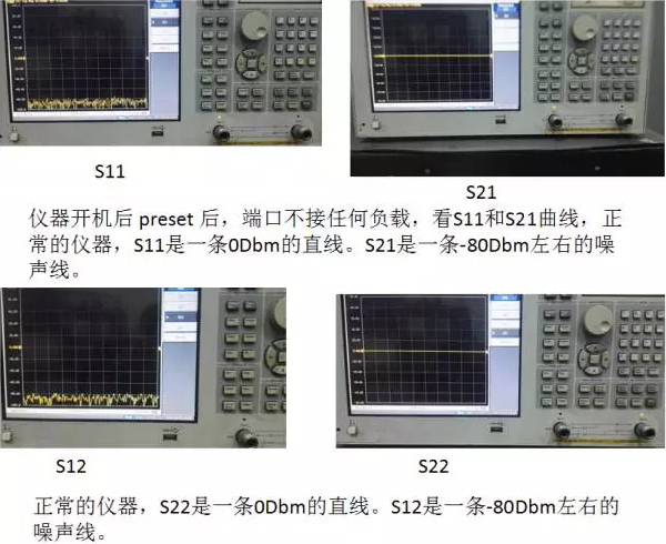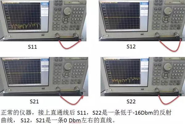 Preset 仪器 ,目测S参数曲线没有问题后,使用标准传输电缆,连接仪器的两个端口(如果仪器是多端口的,则需要分别连接) 看仪器S参数的曲线,如果和下面4张图片一致,那基本上98%以上可以认为这台仪器是好的。可以正常使用的。